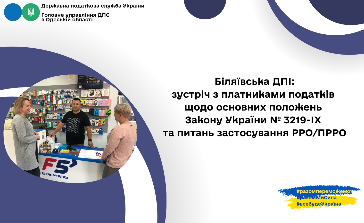 Фахівцями Біляївської ДПІ Головного управління ДПС в Одеській області проведено зустріч з платниками податків щодо поновлення відповідальності за порушення вимог Закону України від 06.07.1995 № 265/95-ВР «Про застосування реєстраторів розрахункових операцій у сфері торгівлі, громадського харчування та послуг» (із змінами, далі – Закон № 265).