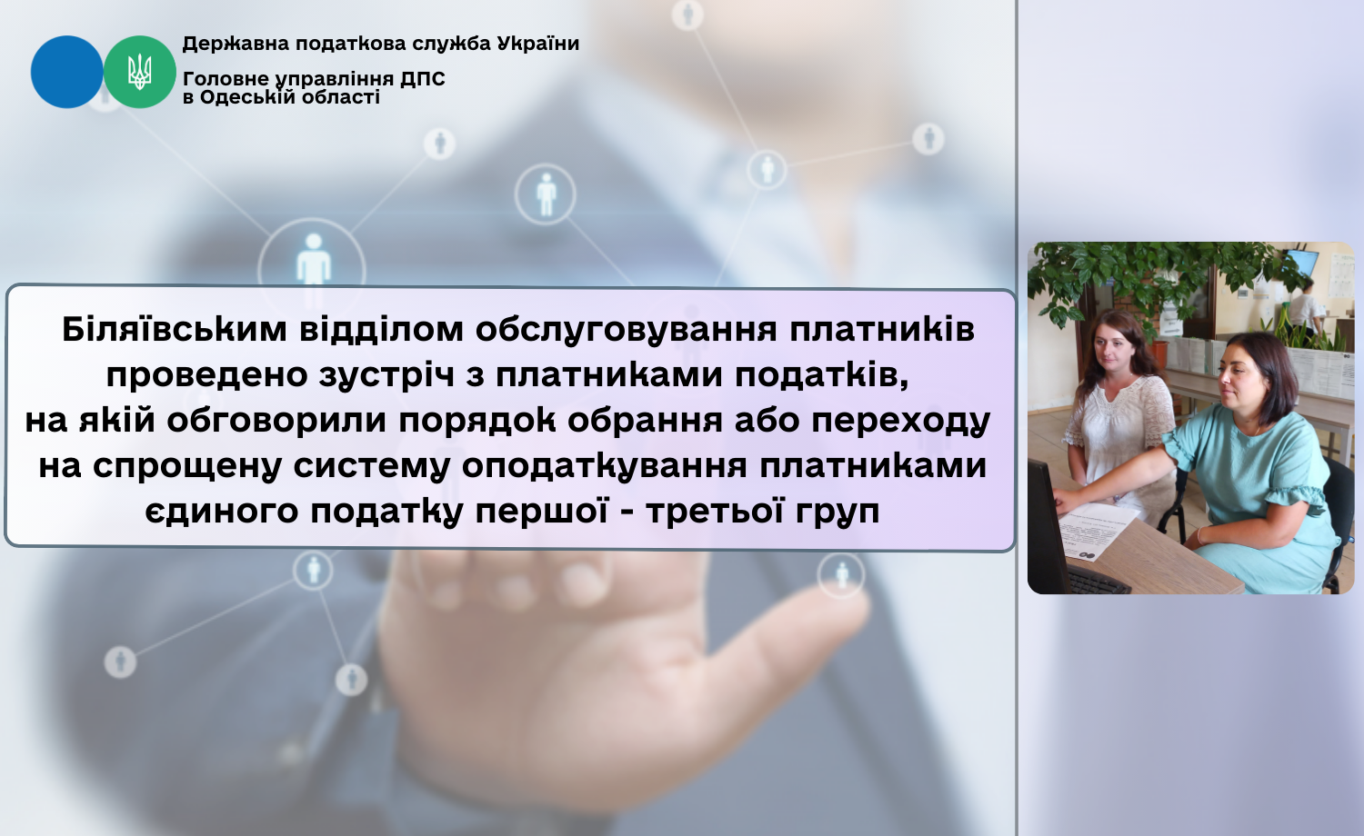 Фахівцями Біляївського відділу обслуговування платників Одеської державної податкової інспекції Головного управління ДПС в Одеській області проведено зустріч з платниками податків, на якій обговорили порядок обрання або переходу на спрощену систему оподаткування платниками єдиного податку першої - третьої груп.