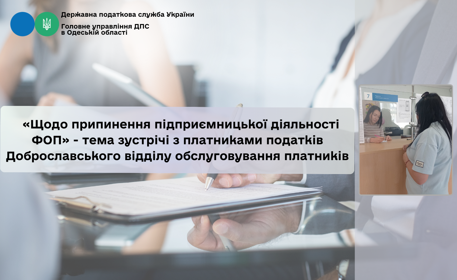 Працівниками Доброславського відділу обслуговування платників Одеської державної податкової інспекції Головного управління ДПС в Одеській області проведено зустріч з платниками податків на тему «Щодо припинення підприємницької діяльності ФОП».