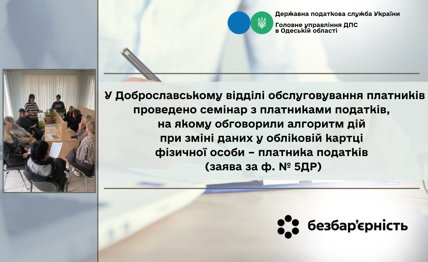 Працівниками Доброславського відділу обслуговування платників Одеської державної податкової інспекції Головного управління ДПС в Одеській області проведено семінар з платниками податків, на якому обговорили алгоритм дій при зміні даних у обліковій картці фізичної особи – платника податків (заява за ф. № 5ДР).