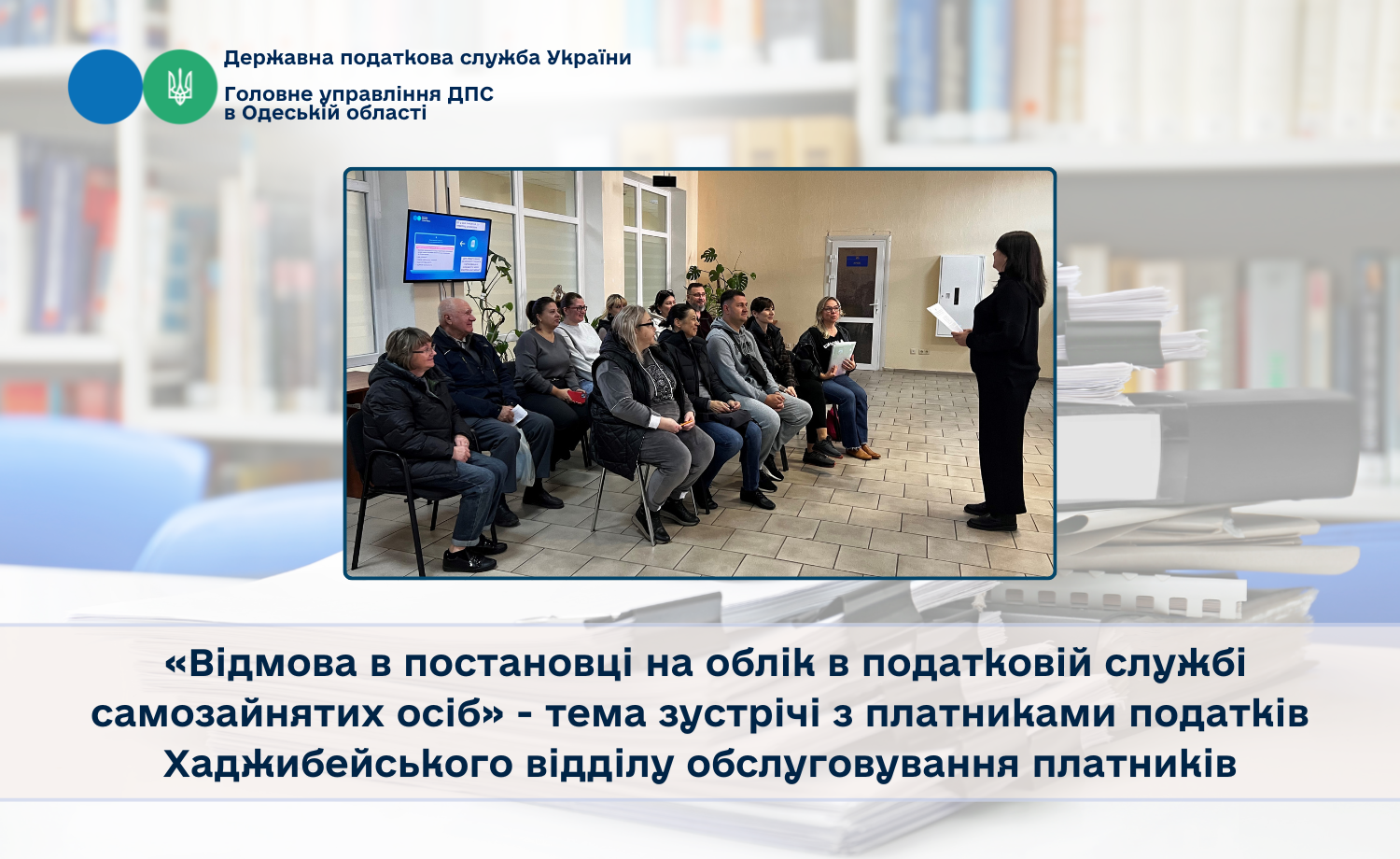 Фахівцями Хаджибейського відділу обслуговування платників Одеської державної податкової інспекції Головного управління ДПС в Одеській області проведено зустріч з платниками податків на тему «Відмова в постановці на облік в податковій службі самозайнятих осіб».