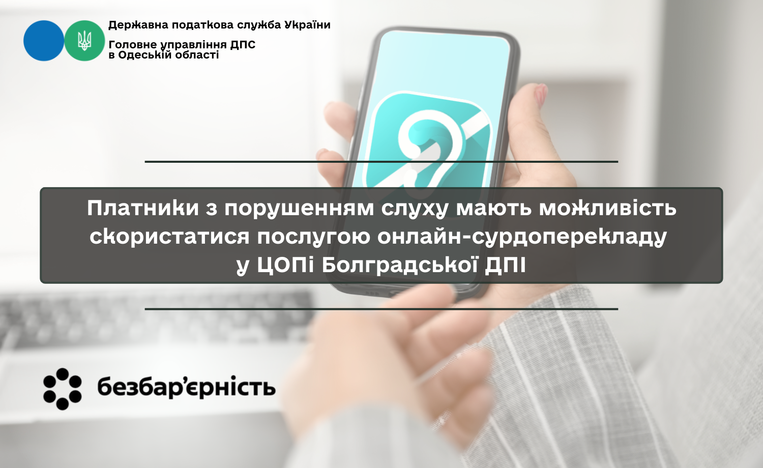 Головне управління ДПС в Одеській області повідомляє, що платникам з порушеннями слуху у Центрі обслуговування платників Болградської державної податкової інспекції Головного управління ДПС в Одеській області пропонується послуга з онлайн перекладу жестовою мовою.
