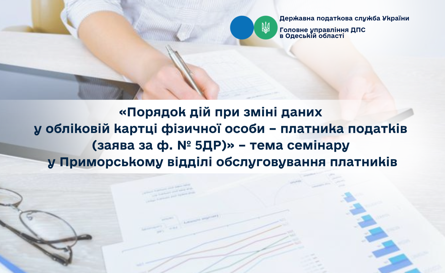 Фахівцями Приморського відділу обслуговування платників Одеської державної податкової інспекції Головного управління ДПС в Одеській області проведено семінар з платниками податків, на якому обговорили порядок дій при зміні даних у обліковій картці фізичної особи – платника податків (заява за ф. № 5ДР).