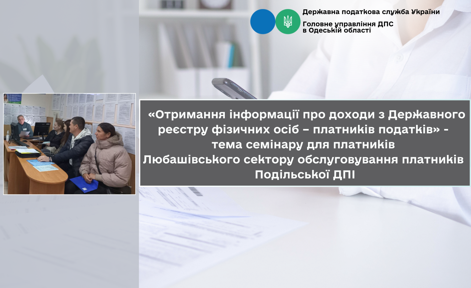 Спеціалістами Любашівського сектору обслуговування платників Подільської державної податкової інспекції Головного управління ДПС в Одеській області проведено семінар для платників податків на тему «Отримання інформації про доходи з Державного реєстру фізичних осіб – платників податків».