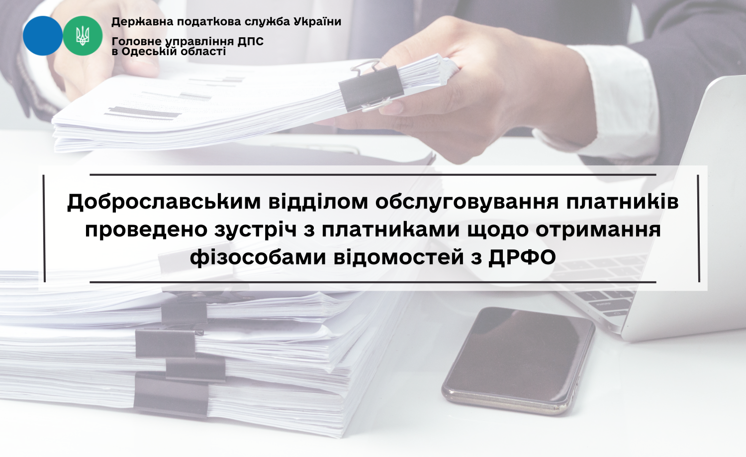 Фахівцями Доброславського відділу обслуговування платників Одеської державної податкової інспекції Головного управління ДПС в Одеській області проведено зустріч з платниками податків, під час якої надано роз’яснення щодо можливості отримання фізичними особами відомостей з ДРФО про джерела/суми нарахованого доходу, нарахованого (перерахованого) податку та військового збору.