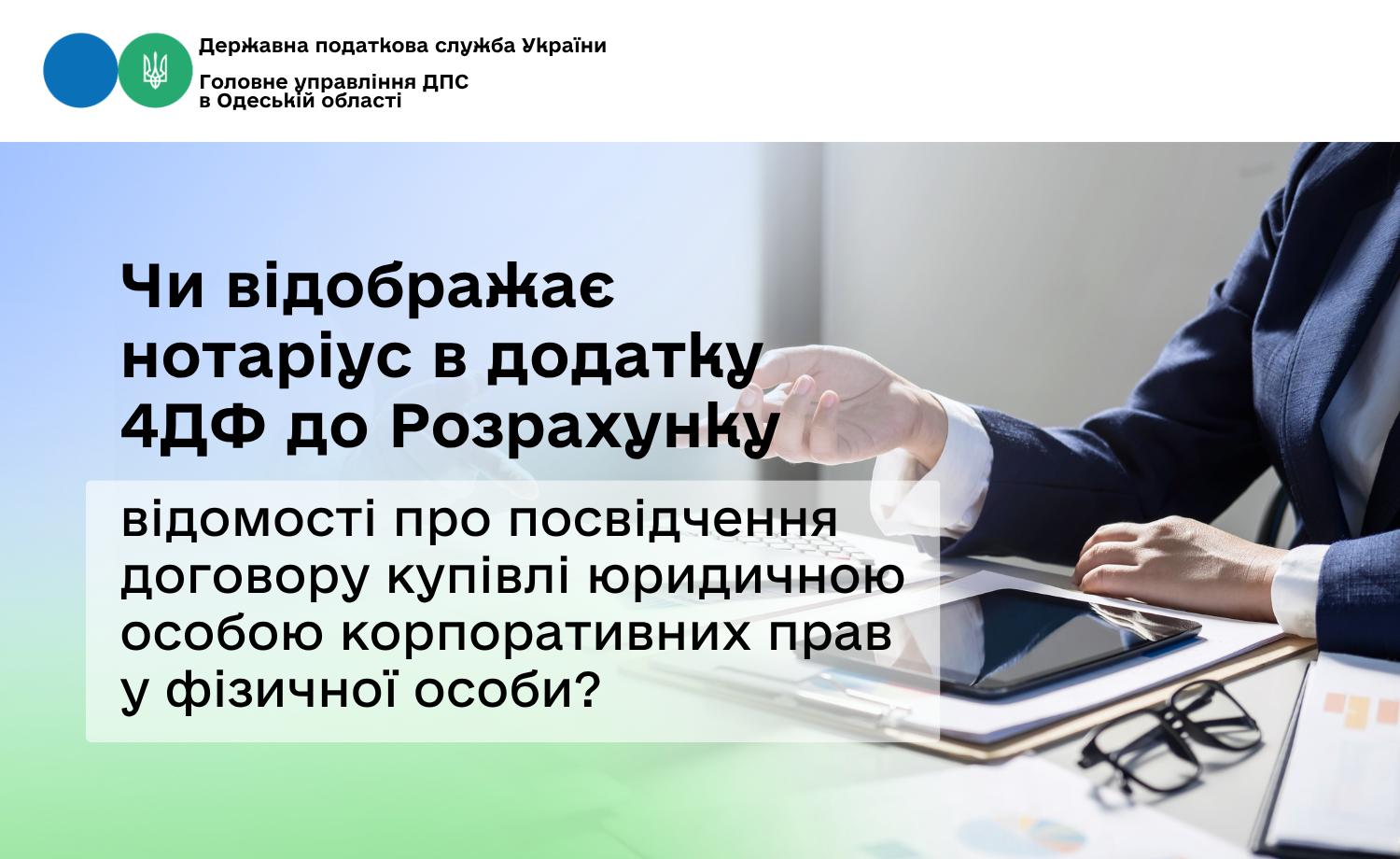 Отже, нотаріус при посвідченні договору купівлі-продажу корпоративних прав, укладеного між юридичною особою (покупцем) та фізичною особою (продавцем) не повинен відображати такі відомості в додатку 4ДФ до Розрахунку, оскільки податковим агентом виступає юридична особа – покупець, яка зобов’язана за ознакою доходу «112» відобразити в додатку 4ДФ до Розрахунку дохід, виплачений на користь фізичної особи за придбані корпоративні права та подати такий Розрахунок до контролюючого органу за основним місцем обліку у строки, встановлені ПКУ для податкового місяця.