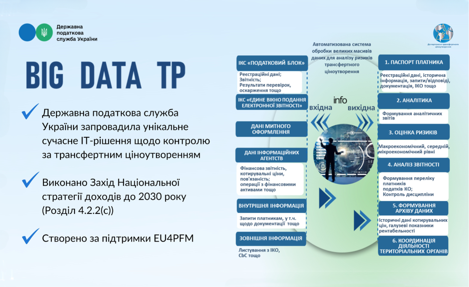 Державна податкова служба України за підтримки EU4PFM, враховуючи вимоги статті 39 Податкового кодексу України та з метою реалізації Національної стратегії доходів до 2030 року, схваленої розпорядженням Кабінету Міністрів України від 27 грудня 2023 року № 1218-р, створила унікальне ІТ-рішення: «Автоматизована система роботи з великими масивами даних для проведення аналізу ризиків з трансфертного ціноутворення» (Big Data Transfer Pricing) для вдосконалення податкового контролю за трансфертним ціноутворенням (ТЦ).