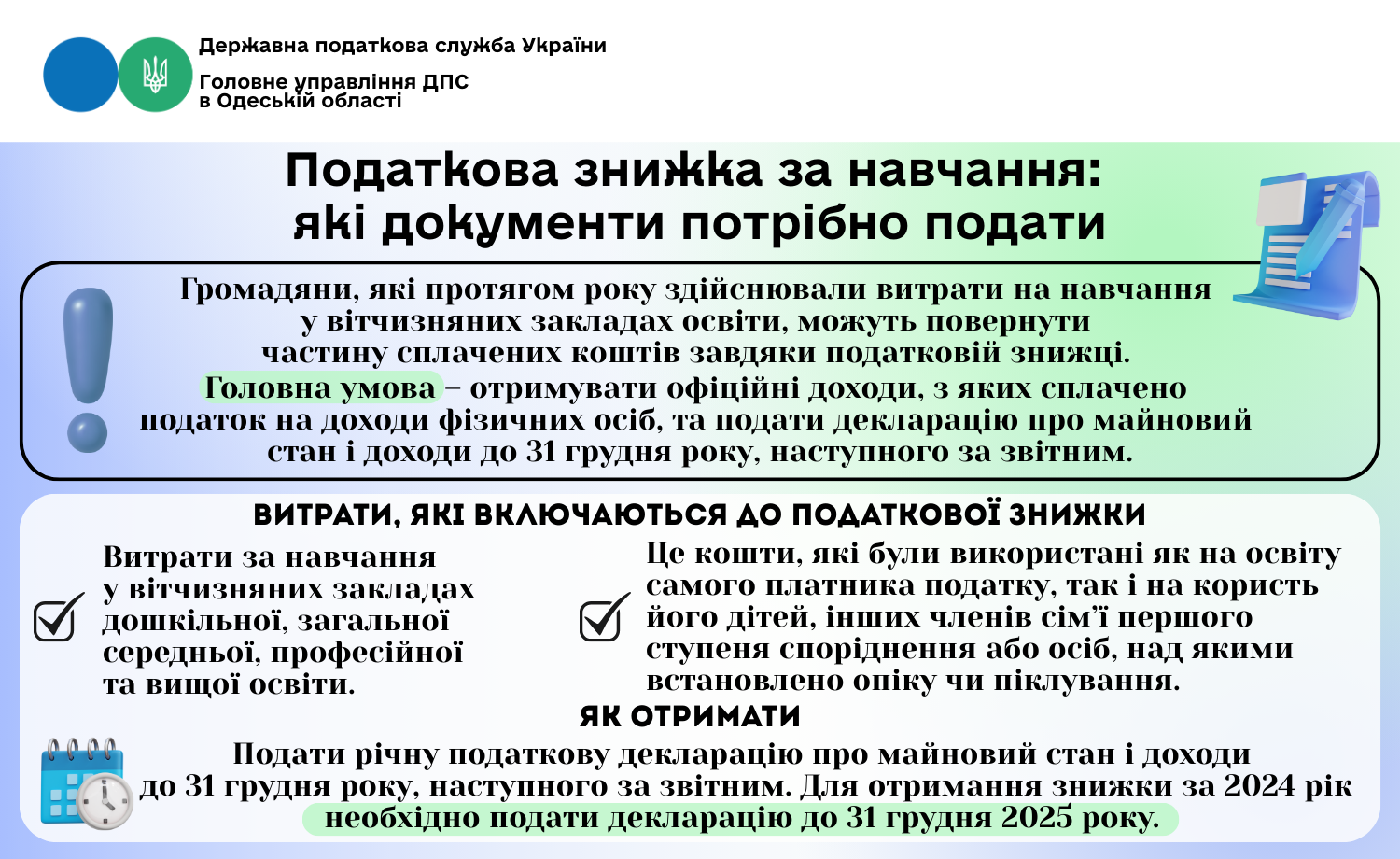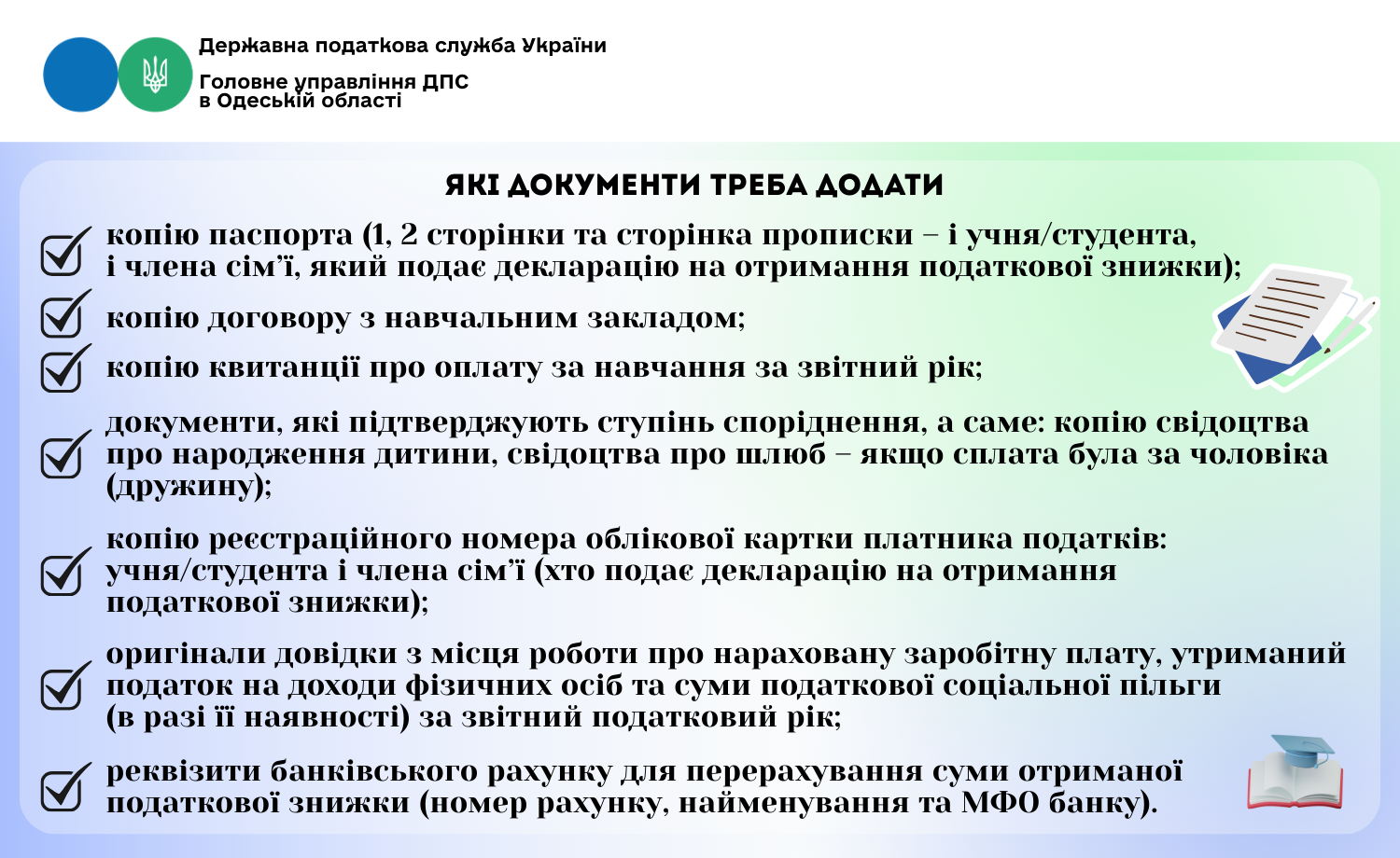 Головне управління ДПС в Одеській області інформує, громадяни, які протягом року здійснювали витрати на навчання у вітчизняних закладах освіти, можуть повернути частину сплачених коштів завдяки податковій знижці.
