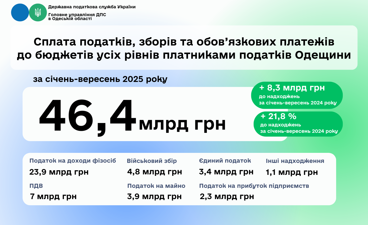 «За січень – вересень 2025 року суб’єкти господарювання Одеської області сплатили 46,4 млрд грн податків, зборів та обов’язкових платежів до бюджетів усіх рівнів. Це на 21,8 % або на 8,3 млрд грн більше ніж за відповідний період 2024 року», – повідомив начальник Головного управління ДПС в Одеській області Юрій Гурський.