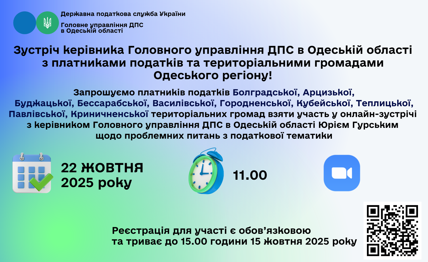 Головне управління ДПС в Одеській області запрошує платників податків Болградської, Арцизької, Буджацької, Бессарабської, Василівської, Городненської, Кубейської, Теплицької, Павлівської, Криничненської  територіальних громад взяти участь у онлайн-зустрічі з керівником Головного управління ДПС в Одеській області Юрієм Гурським щодо проблемних питань з податкової тематики.