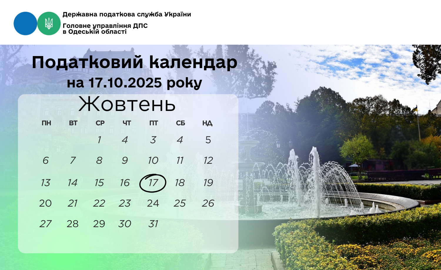 Головне управління ДПС в Одеській області нагадує, що 17 жовтня 2025 року – останній день сплати: