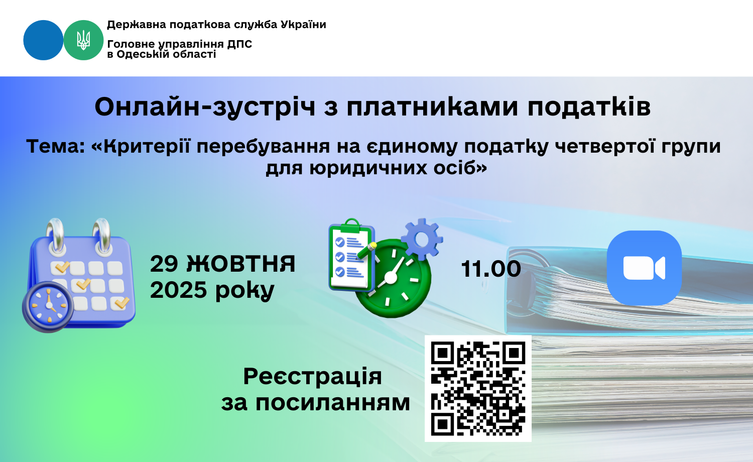 Головне управління ДПС в Одеській області запрошує платників податків регіону взяти участь в онлайн-зустрічі на тему: «Критерії перебування на єдиному податку четвертої групи для юридичних осіб».