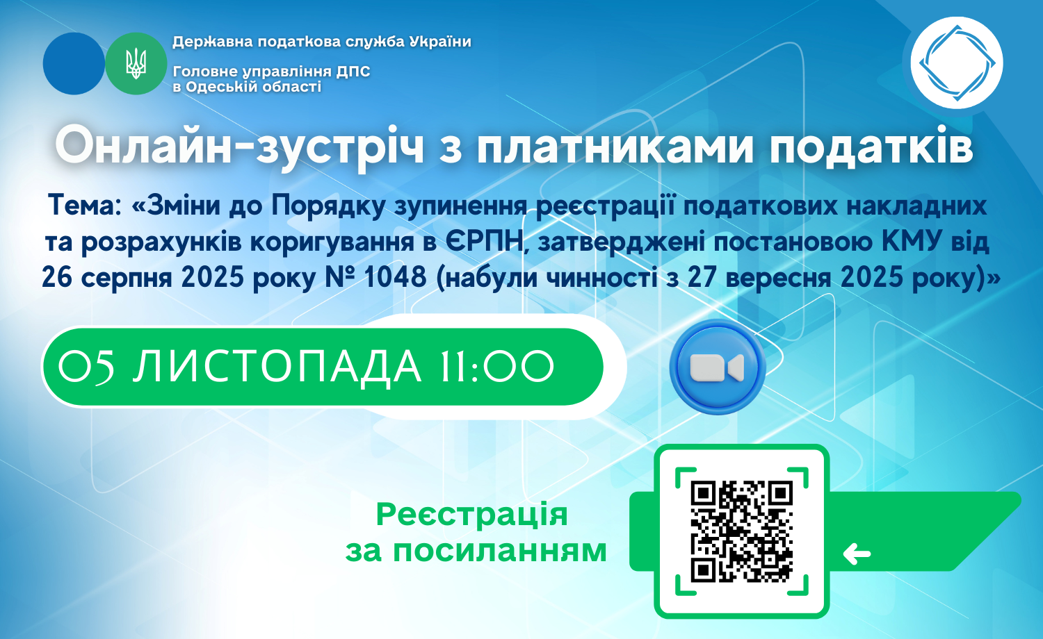 Головне управління ДПС в Одеській області запрошує платників податків регіону взяти участь в онлайн-зустрічі на тему: «Зміни до Порядку зупинення реєстрації податкових накладних та розрахунків коригування в ЄРПН, затверджені постановою КМУ від 26 серпня 2025 року № 1048 (набули чинності з 27 вересня 2025 року)».