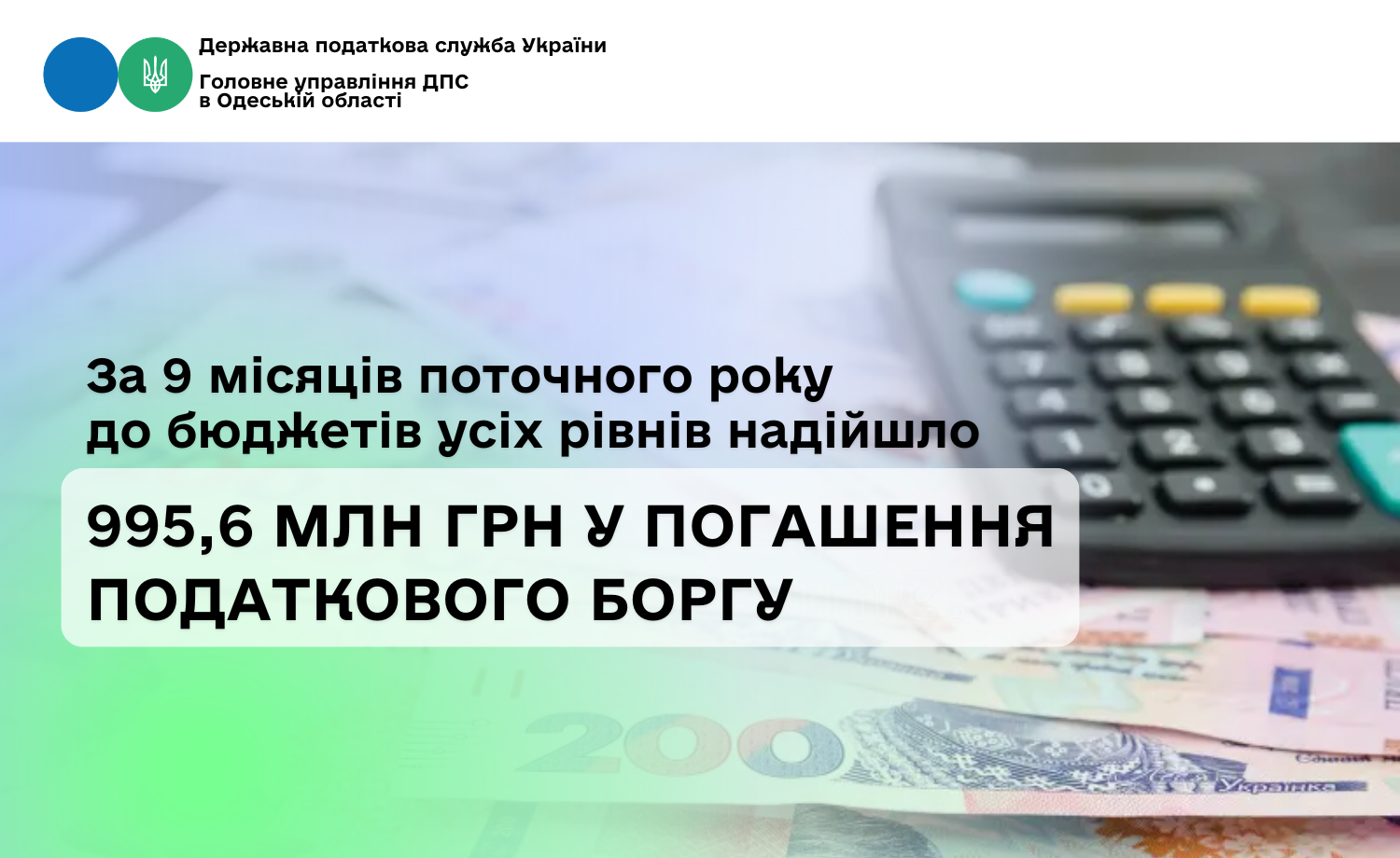 З початку 2025 року в результаті вжитих Головним управлінням ДПС в Одеській області заходів із погашення податкового боргу до бюджетів усіх рівнів надійшло 995,6 млн гривень. Із загальної суми, юридичні особи сплатили в рахунок погашення боргу 641,5 млн грн, а фізичні особи – 354,1 млн гривень.