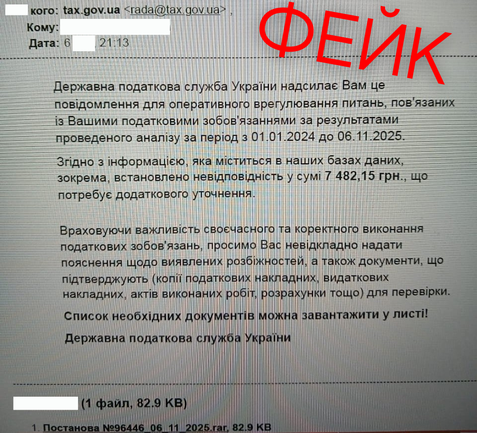 Головне управління ДПС в Одеській області звертає увагу щодо розсилки фейкових електронних листів нібито «від імені Державної податкової служби України про оперативне врегулювання питань пов’язаних з податковими зобов’язаннями» з вкладенням у вигляді RAR-файлу, який містить «Постанова_№_96446_06_11_2025.rar», 82.9 КВ.
