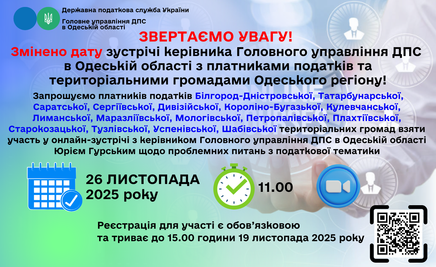 Головне управління ДПС в Одеській області запрошує платників податків Білгород-Дністровської, Татарбунарської, Саратської, Сергіївської, Дивізійської, Короліно-Бугазької, Кулевчанської, Лиманської, Маразліївської, Мологівської, Петропалівської, Плахтіївської, Старокозацької, Тузлівської, Успенівської, Шабівської територіальних громада взяти участь у онлайн-зустрічі з керівником Головного управління ДПС в Одеській області Юрієм Гурським щодо проблемних питань з податкової тематики.