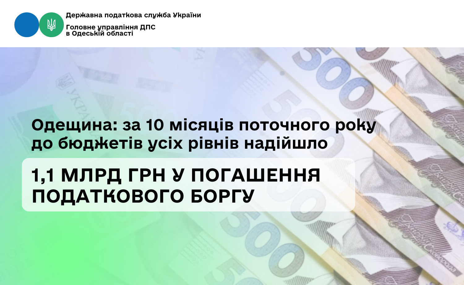 Упродовж січня - жовтня поточного року в результаті вжитих Головним управлінням ДПС в Одеській області заходів із погашення податкового боргу до бюджетів усіх рівнів надійшло 1,1 млрд гривень. Із загальної суми, юридичні особи сплатили в рахунок погашення боргу 706,9 млн грн, а фізичні особи – 409,1 млн гривень.