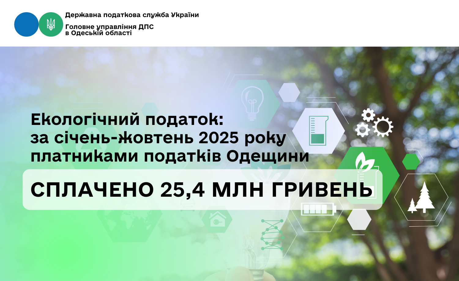 Протягом січня – жовтня 2025 року платники податків Одещини перерахували до державного бюджету 25,4 млн грн екологічного податку. Це на 9,4 %, або на 2,2 млн грн більше відповідного показника минулого року.