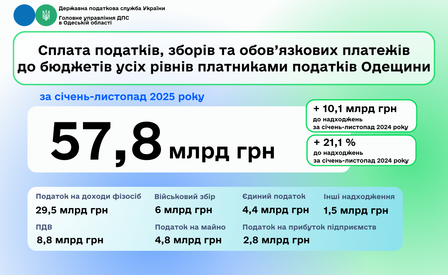 «За січень – листопад 2025 року суб’єкти господарювання Одеської області сплатили 57,8 млрд грн податків, зборів та обов’язкових платежів до бюджетів усіх рівнів, що на 21,1 %, або на 10,1 млрд грн більше ніж за 11 місяців 2024 року», – повідомив начальник Головного управління ДПС в Одеській області Юрій Гурський.