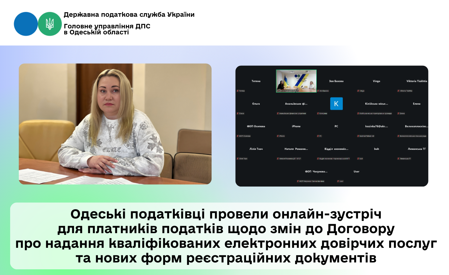 Одеські податківці провели онлайн-зустріч для платників податків щодо змін до Договору про надання кваліфікованих електронних довірчих послуг та нових форм реєстраційних документів