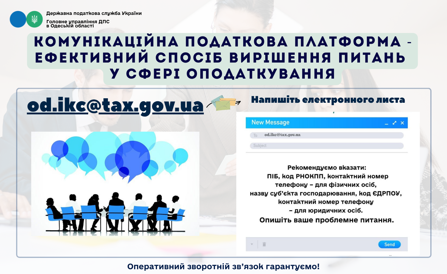 Комунікаційна податкова платформа (od.ikc@tax.gov.ua), яка працює в Головному управлінні ДПС в Одеській області, дозволяє швидко та якісно вирішити питання, які виникають у платників податків у процесі їхньої господарської діяльності.