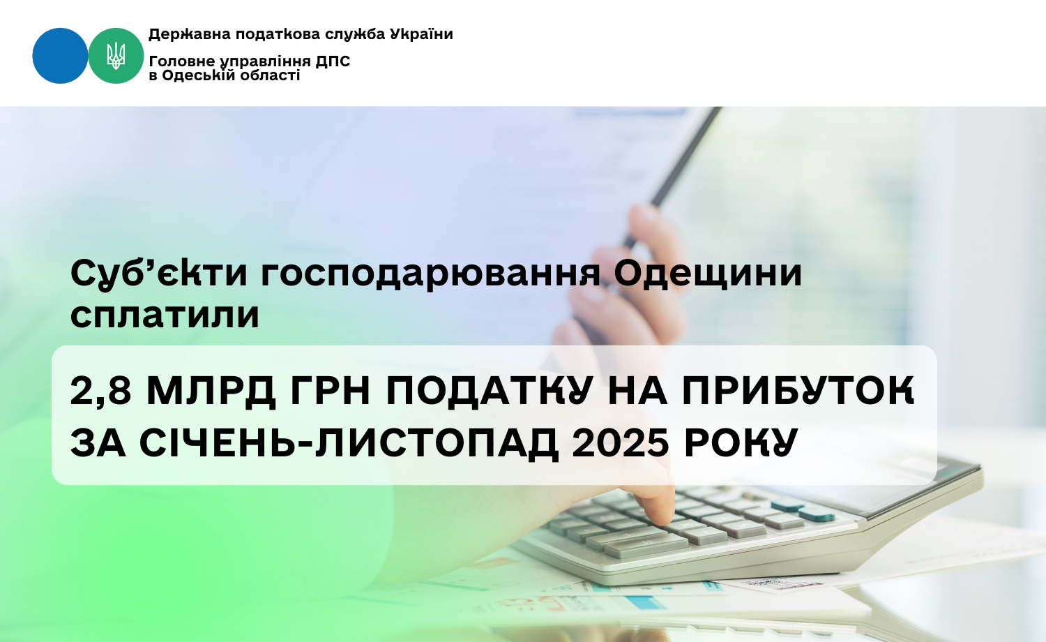 За 11 місяців 2025 року платники податків Одеського регіону сплатили до бюджетів усіх рівнів 2,8 млрд грн податку на прибуток. Із загальної суми до державного бюджету суб'єктами господарювання області сплачено 2,5 млрд грн, а до місцевих бюджетів – 0,3 млрд гривень.