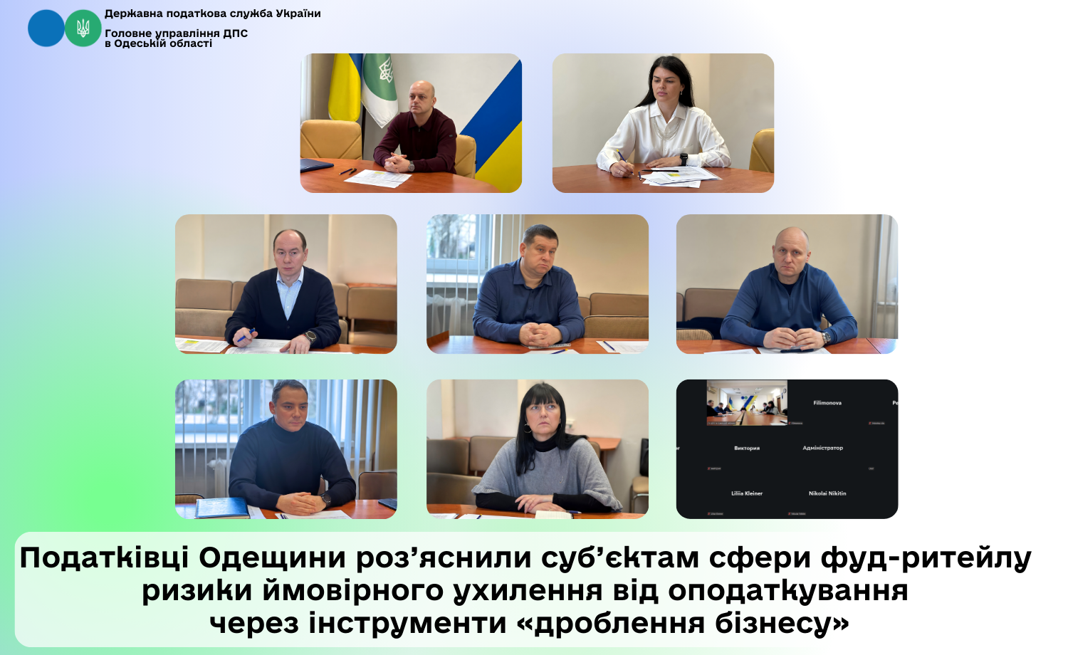 Начальник Головного управління ДПС в Одеській області Юрій Гурський, в. о. заступника начальника Головного управління ДПС в Одеській області Ніна Сара та представники структурних підрозділів Головного управління ДПС в Одеській області провели засідання «круглого столу» з суб’єктами господарювання сфери фуд-ритейлу (роздрібна торгівля в неспеціалізованих магазинах, у тому числі підакцизною групою товарів) щодо схем ухилення від сплати податків шляхом «дроблення бізнесу», ризиків та негативних наслідків для підприємців.