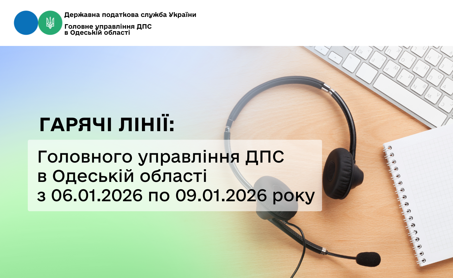 | 06.01.2026 10:00 -12:00 | Особливості заповнення та подання Заяви про об’єкти оподаткування або об’єкти, пов’язані з оподаткуванням або через які провадиться діяльність за формою № 20-ОПП. Надання практичної допомоги платникам податків | Управління податкових сервісів Головного управління ДПС в Одеській області (04868)95601 |