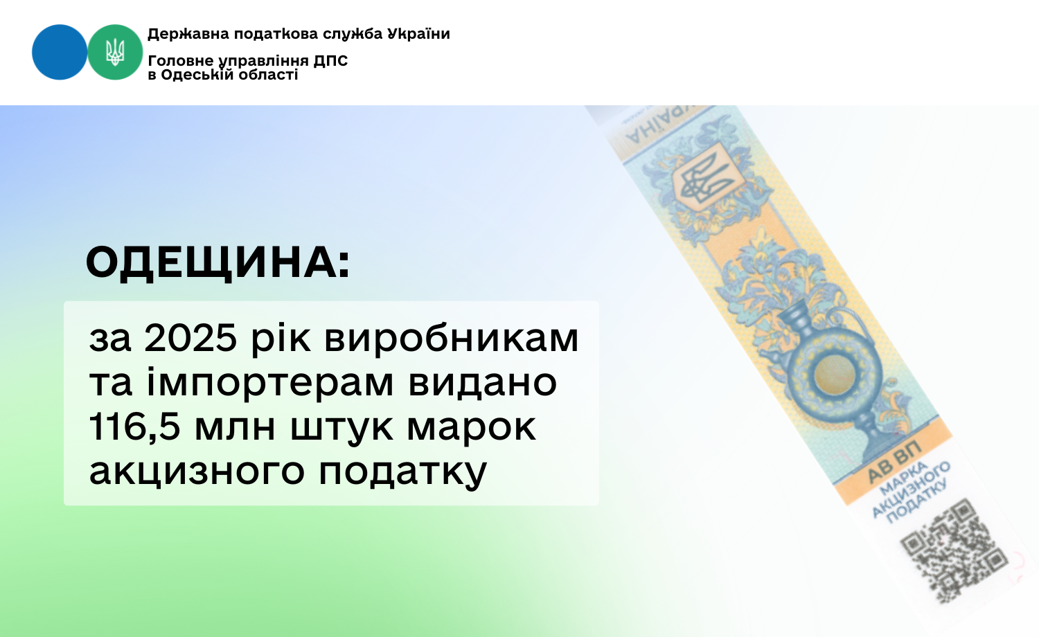 Головним управлінням ДПС в Одеській області протягом 2025 року виробникам та імпортерам Одещини видано 116,5 млн штук марок акцизного податку, з них для маркування: