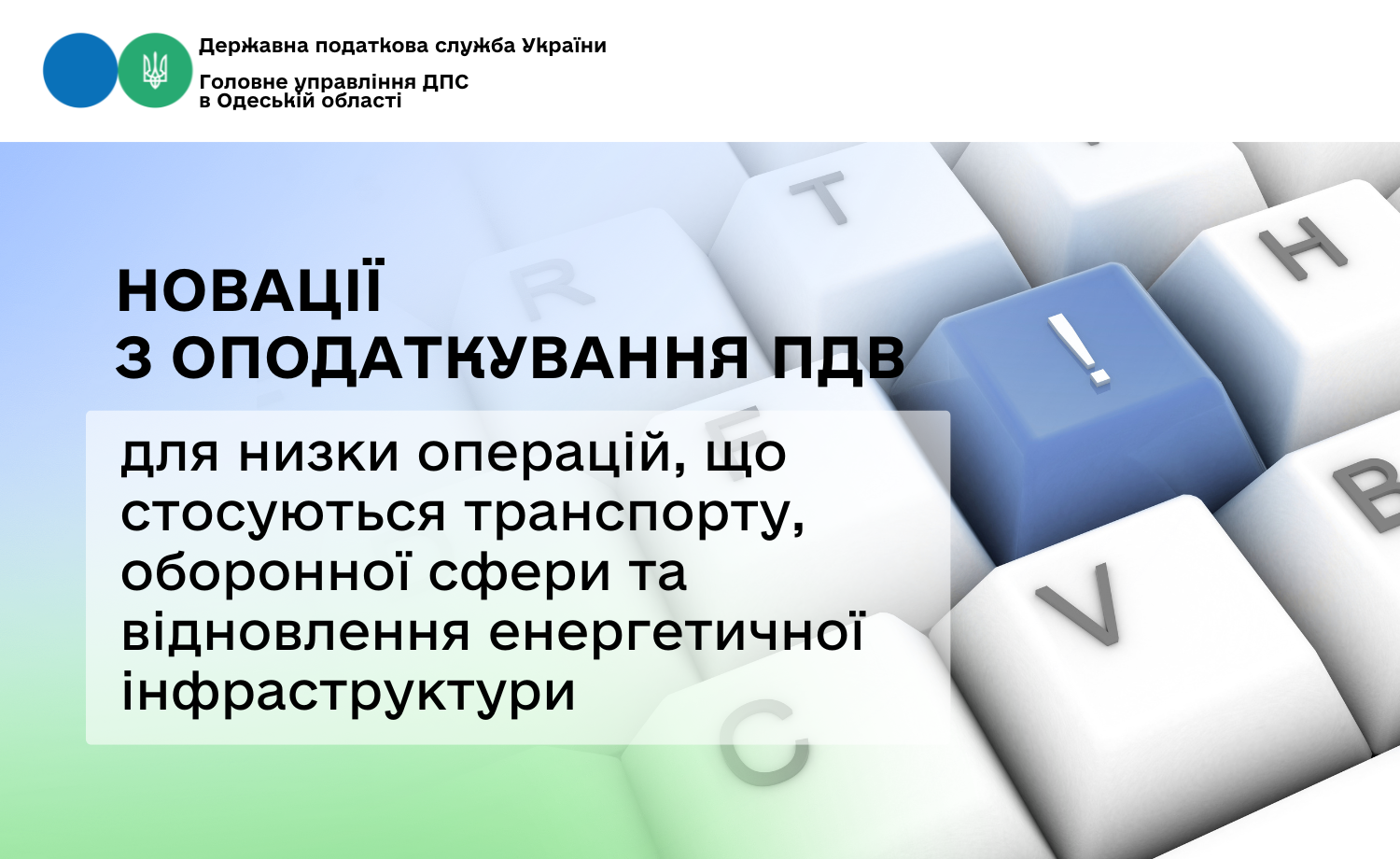 Головне управління ДПС в Одеській області інформує, що з 01 січня 2026 року в Україні набули чинності новації з оподаткування ПДВ для низки операцій, що стосуються транспорту, оборонної сфери та відновлення енергетичної інфраструктури.
