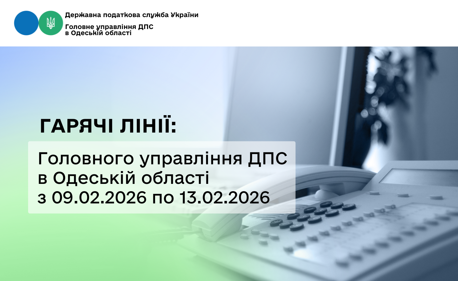 | 11.02.2026 13:00 -14:00 | Декларування доходів громадян та подання декларації на право отримання податкової знижки | Фомюк Ольга Степанівна головний державний інспектор Центрального відділу податків і зборів з фізичних осіб та проведення камеральних перевірок управління оподаткування фізичних осіб Головного управління ДПС в Одеській області (04855)96225 |