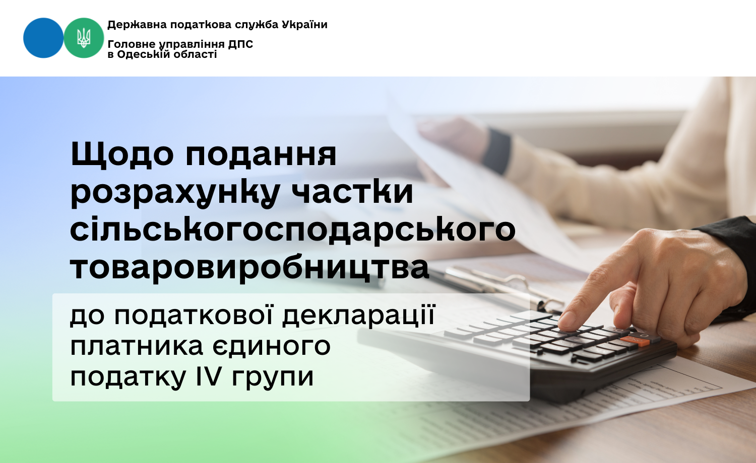 Головне управління ДПС в Одеській області інформує, що відповідно до п.п. «а» п.п. 4 п. 291.4 ст. 291 Податкового кодексу України від 02 грудня 2010 року № 2755-VI (зі змінами, далі – ПКУ) до платників єдиного податку, які відносяться до четвертої групи, належать сільськогосподарські товаровиробники – юридичні особи незалежно від організаційно-правової форми, у яких частка сільськогосподарського товаровиробництва за попередній податковий (звітний) рік дорівнює або перевищує 75 відсотків.