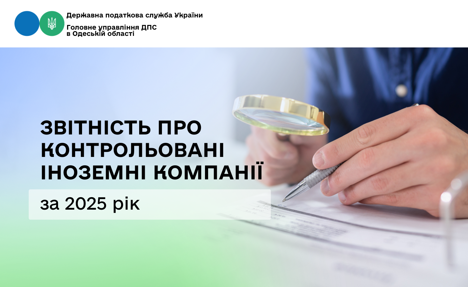 Враховуючи вищевикладене, Головне управління ДПС в Одеській області звертає увагу фізичних осіб-резидентів України, що є контролюючими особами відповідно до положень підпункту 392.1.2 пункту 392.1 статті 392 ПКУ, про необхідність подання звітів про контрольовані іноземні компанії за 2025 рік до 1 травня 2026 року.