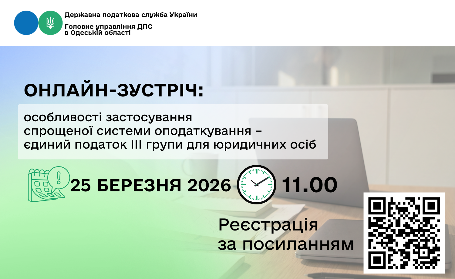 Головне управління ДПС в Одеській області запрошує платників податків регіону взяти участь в онлайн-зустрічі щодо особливостей застосування спрощеної системи оподаткування – єдиного податку ІІІ групи для юридичних осіб, умов перебування та нововведень у 2025-2026 роках.