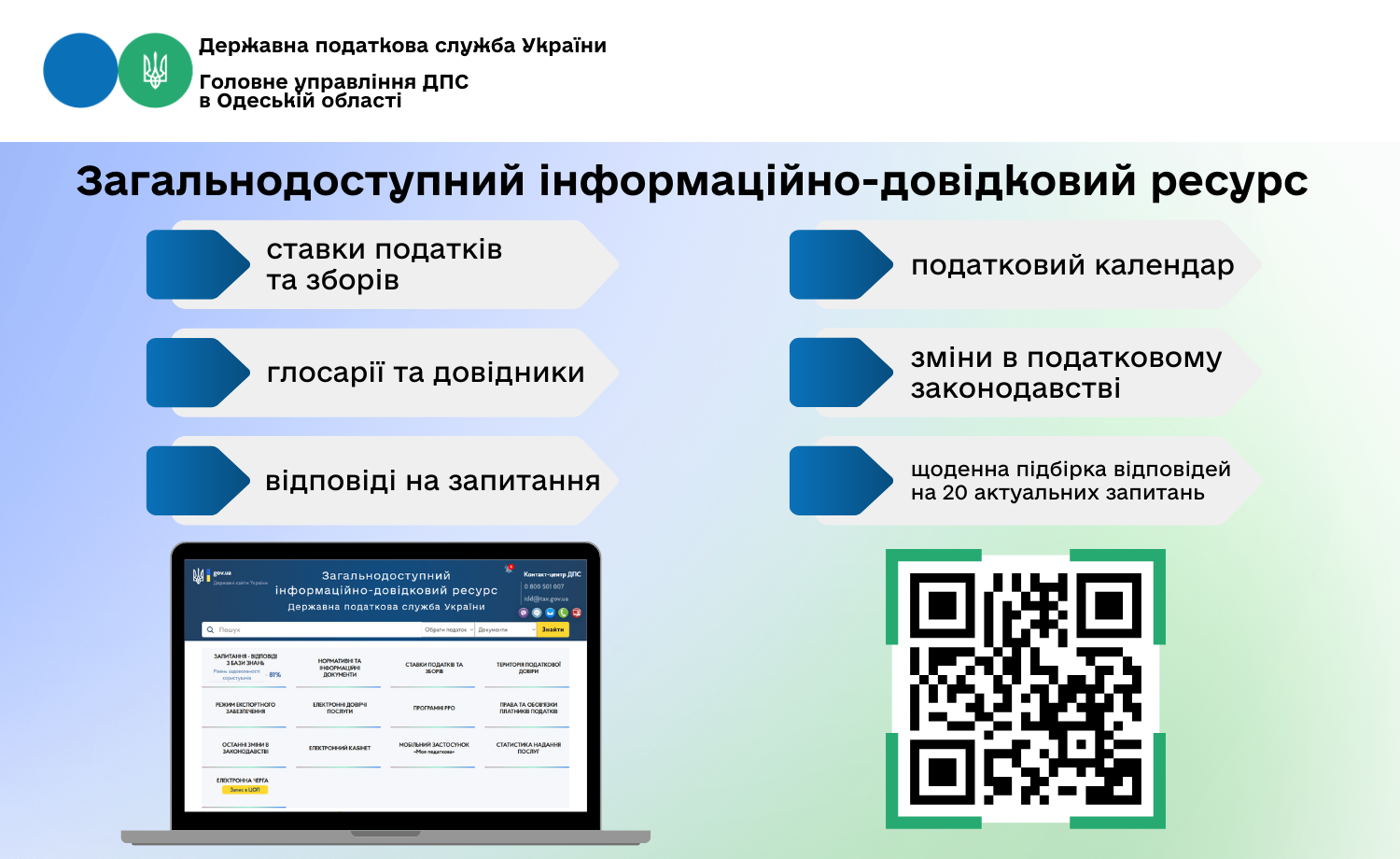 Також, на Загальнодоступному інформаційно-довідковому ресурсі ДПС можна ознайомитись із ставками податків та зборів, податковим календарем, приєднатися до сервісу отримання інформації про останні зміни в податковому законодавстві, ознайомитись із переліком адміністративних послуг; отримати інформацію про Центри обслуговування платників та багато іншого.