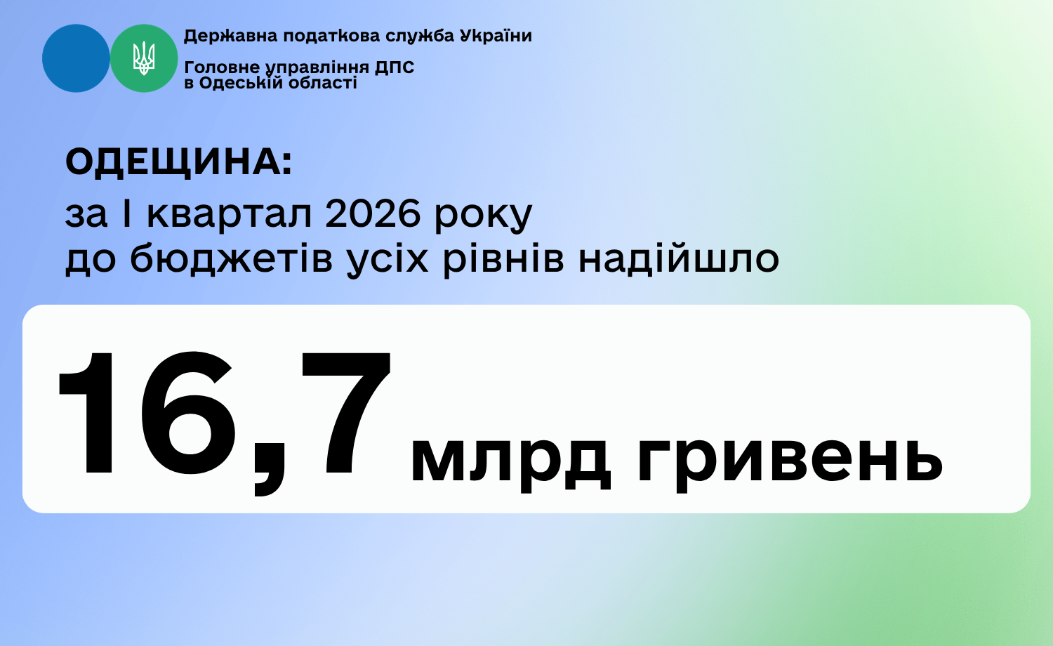 Із загальної суми сплати до державного бюджету за І квартал 2026 року сплачено платниками податків регіону 9,9 млрд грн, що на 13,3 %, або на 1,2 млрд грн більше ніж за січень - березень 2025 року, а до бюджетів громад Одеської області суб’єктами господарювання сплачено 6,8 млрд грн, що на 13,6 %, або на 0,8 млрд грн більше ніж за аналогічний період.