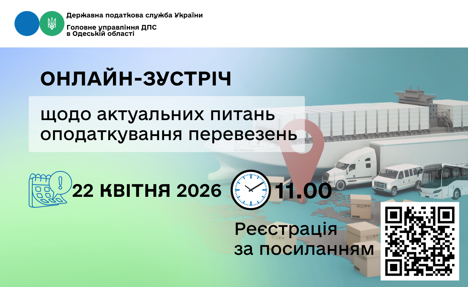 Головне управління ДПС в Одеській області запрошує платників податків долучитися до онлайн-зустрічі з актуальних питань оподаткування внутрішніх та міжнародних перевезень (регулярних та нерегулярних, пасажирських перевезень, а також перевезень вантажів).