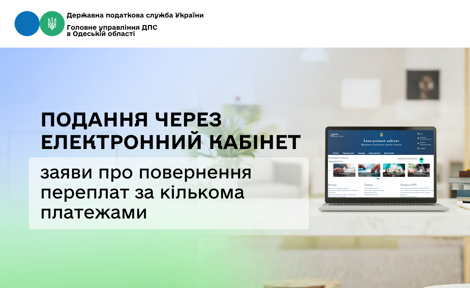 У приватній частині Електронного кабінету платник в режимі «Введення звітності», обравши параметри фільтра: «рік», «період», «тип форми» (наприклад, «J(F)13 Запити»), створює Заяву про повернення помилково та/або надміру сплачених сум грошових зобов’язань та пенi (далі – Заява). Зі списку електронних форм обирається потрібна форма Заяви (J1302002 – для юридичних осіб або F1302002 – для фізичних осіб). У запропонованій формі необхідно заповнити відповідні поля електронного документа, підписати та надіслати Заяву до територіального органу ДПС за місцем адміністрування (обліку) помилково та/або надміру сплаченої суми.