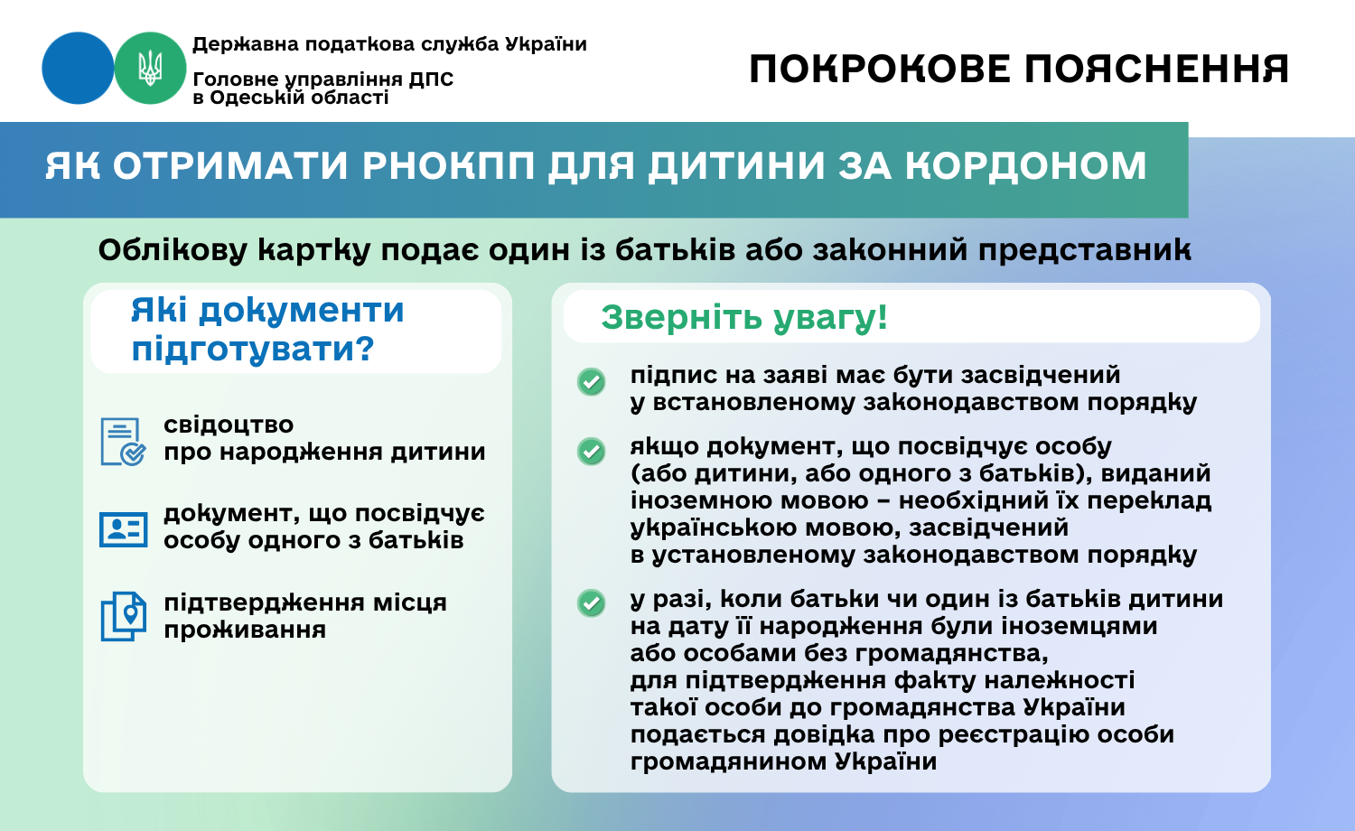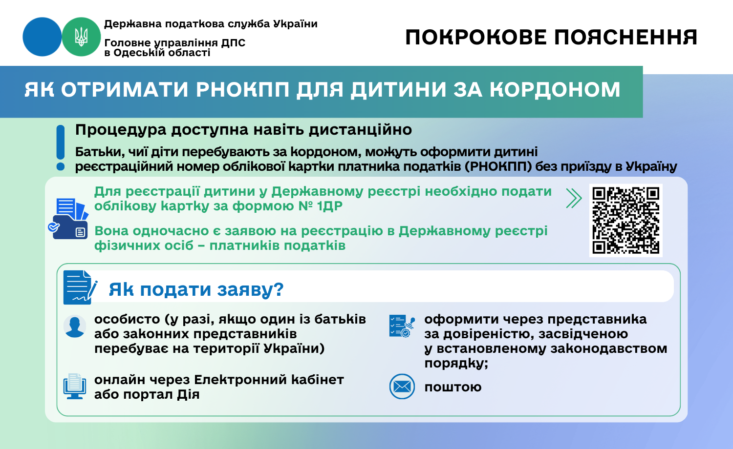 Головне управління ДПС в Одеській області інформує, батьки, чиї діти перебувають за кордоном, можуть оформити дитині реєстраційний номер облікової картки платника податків (РНОКПП) без приїзду в Україну. Процедура доступна навіть дистанційно.