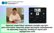 Під час зустрічі, головний державний інспектор відділу аналітичної роботи управління оподаткування юридичних осіб Головного управління ДПС в Одеській області Ольга Пріступ, окреслила коло платників, які можуть перебувати на четвертій групі єдиного податку, терміни звітування та сплати такими суб’єктами господарювання єдиного податку, визначені законодавством обмеження перебування на спрощеній системі оподаткування для платників четвертої групи тощо.