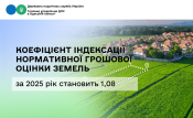 Значення коефіцієнта індексації нормативної грошової оцінки земель за 2025 рік становить 1,08 (зазначений коефіцієнт індексації нормативної грошової оцінки земель застосовується для всіх категорій земель і видів земельних угідь).