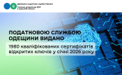 Протягом січня 2026 року 990 платників податків скористався послугами Кваліфікованого надавача електронних довірчих послуг Державної податкової служби України в Одеській області отримавши 1 980 кваліфікованих сертифікатів відкритих ключів, з них 717 юридичних осіб – 1 434 кваліфіковані сертифікати відкритих ключів для ведення звітності, укладання угод та інших операцій, а 273 фізичні особи – 546 кваліфікованих сертифікатів відкритих ключів.
