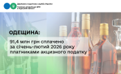 За січень-лютий 2026 року до бюджетів усіх рівнів платники акцизного податку Одеської області сплатили 91,4 млн гривень. З яких, до державного бюджету ‒ 22,4 млн грн, а до місцевих бюджетів ‒ 69 млн гривень.