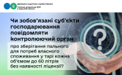 Отже, суб’єкти господарювання не зобов’язані повідомляти контролюючий орган про зберігання пального виключно для потреб власного споживання та/або промислової переробки у споживчій тарі, тарі споживача та поворотній тарі (газових балонах), кожна об’ємом до 60 літрів без наявності ліцензії. Зберігання пального виключно для потреб власного споживання та/або промислової переробки у споживчій тарі, тарі споживача та поворотній тарі (газових балонах), кожна об’ємом до 60 літрів без наявності ліцензії, не є підставою для застосування відповідальності за зберігання пального без ліцензії.