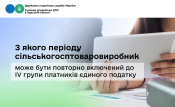 Згідно з п.п. 298.8.8 п. 298.8 ст. 298 ПКУ сільськогосподарський товаровиробник повторно може бути включений до четвертої групи платників єдиного податку не раніше ніж через два календарні роки після його переходу на застосування ставки єдиного податку, визначеної для платників єдиного податку іншої групи, або анулювання його попередньої реєстрації платником єдиного податку четвертої групи.